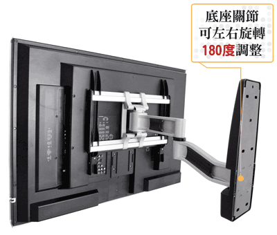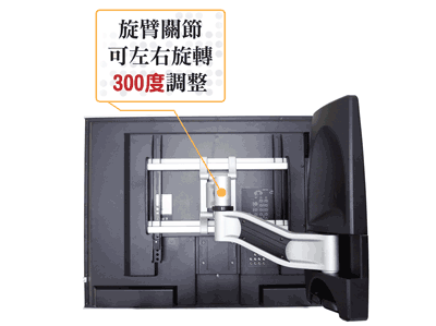 壁掛架的前段關節可左右旋轉的角度為180度、中段關節可左右旋轉的角度為300度、後段關節可左右旋