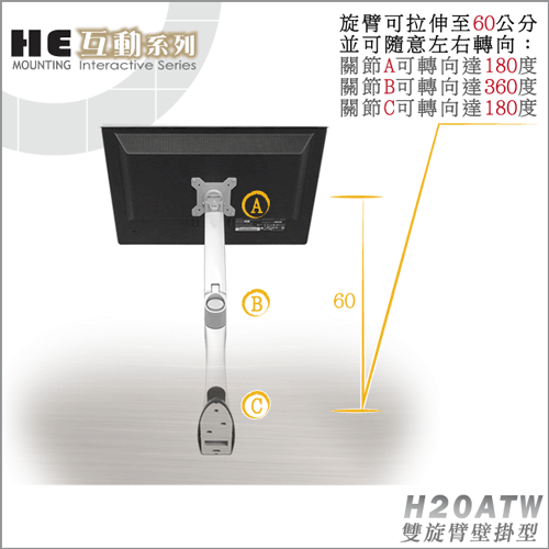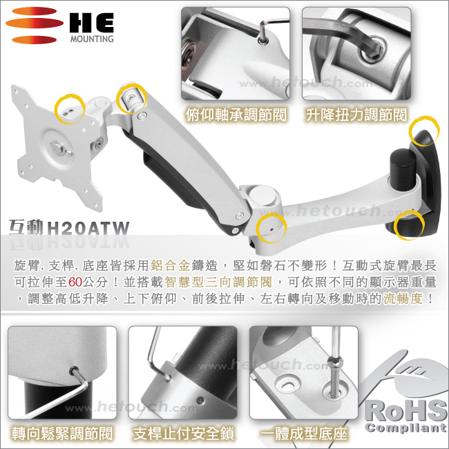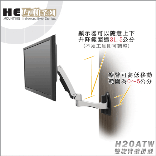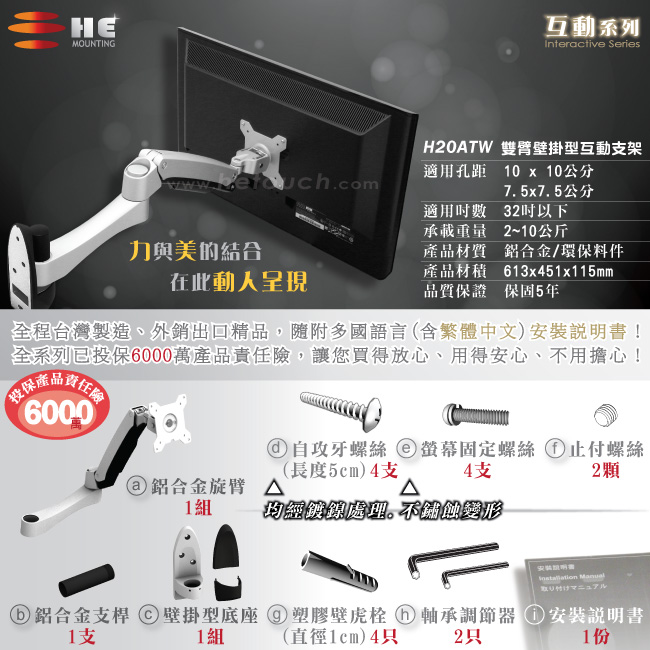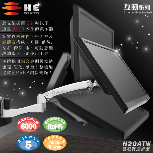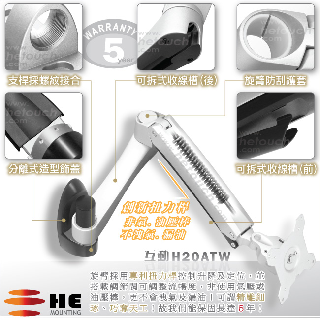 非採用氣壓或油壓棒控制升降,沒有洩氣及漏油等問題,所以裝置新一代扭力桿的旋臂,可耐重2公斤之上10公斤之下的顯示器,不會日久鬆弛、一蹶不振,故HE能提供長達5年的保固期。
