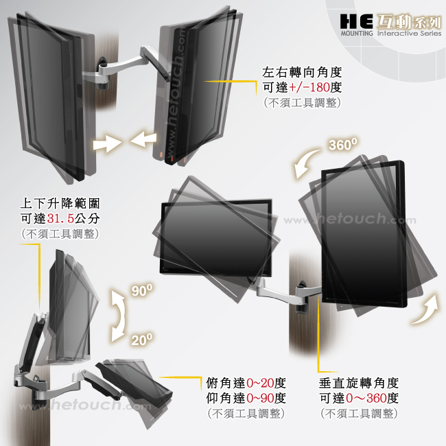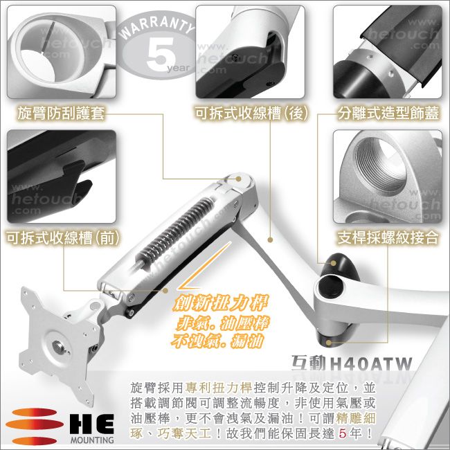 非採用氣壓或油壓棒控制升降,沒有洩氣及漏油等問題,所以裝置新一代扭力桿的旋臂,每支臂可耐重2公斤以上10公斤以下的顯示器,不會日久鬆弛、一蹶不振,故HE能提供長達5年的保固期。