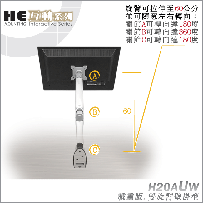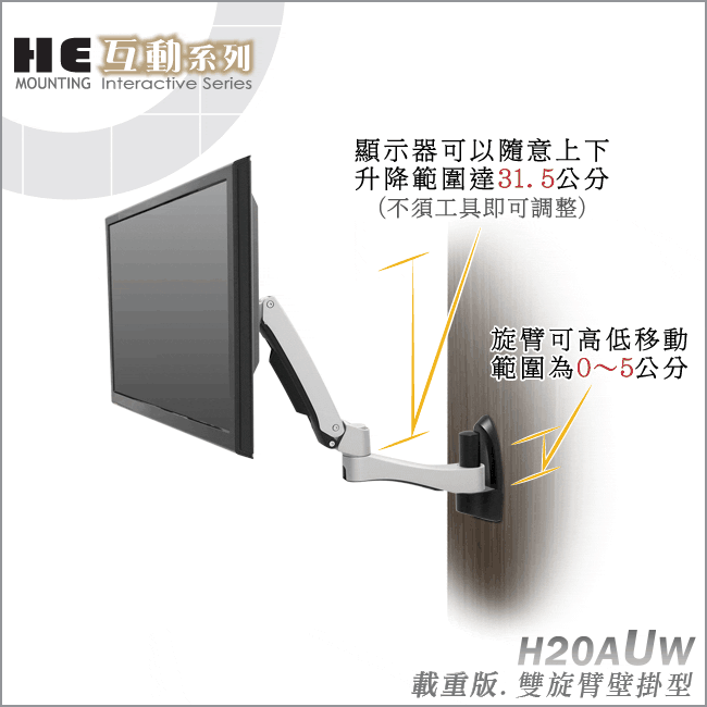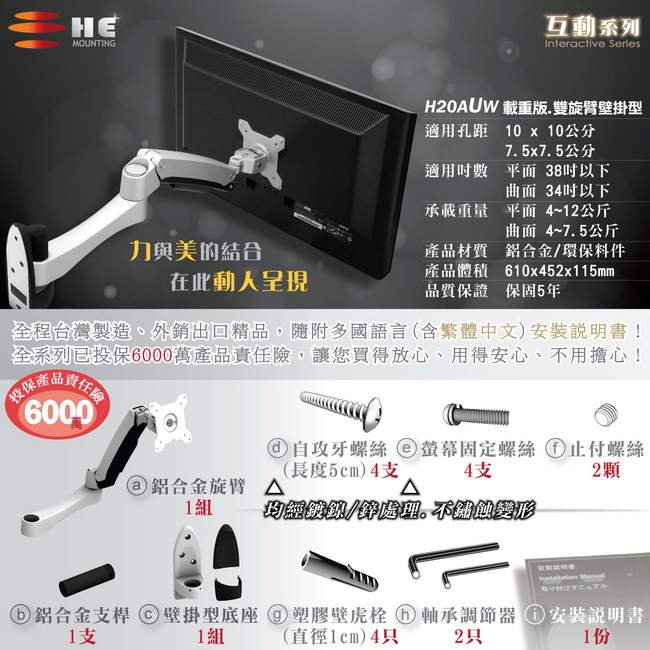 非採用氣壓或油壓棒控制升降,沒有洩氣及漏油等問題,所以裝置新一代扭力桿的旋臂,可耐重4公斤以上12公斤以下的平面液晶顯示器或4公斤以上7.5公斤以下的曲面顯示器,不會日久鬆弛、一蹶不振,故HE能提供長達5年的保固期。