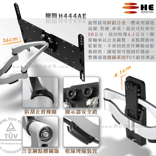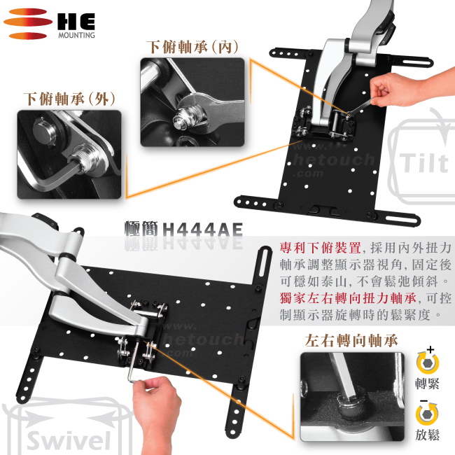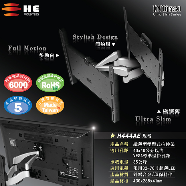 電視,不堪一摔! 所以HE堅持以消費者的安全性為優先考量,推薦您這一款H444AE壁掛架!