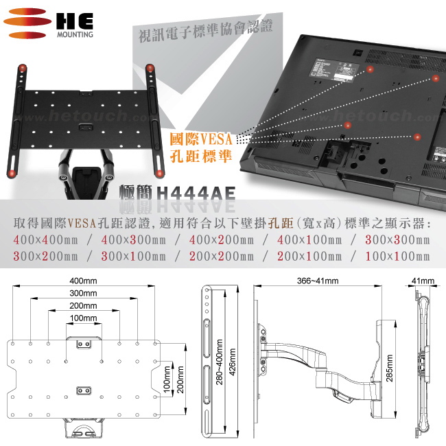 種標準孔距,但各廠商又因為電視大小與重量不同而使用不同的標準孔距,為因應繁多的孔距,HE在此