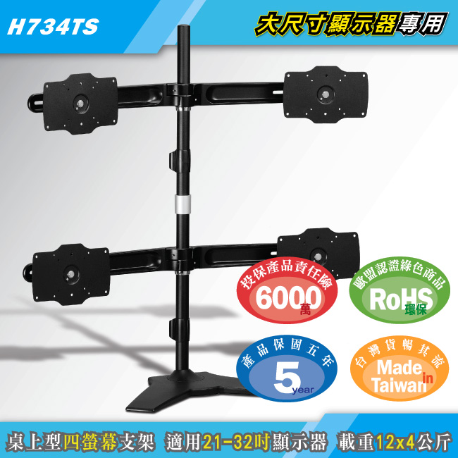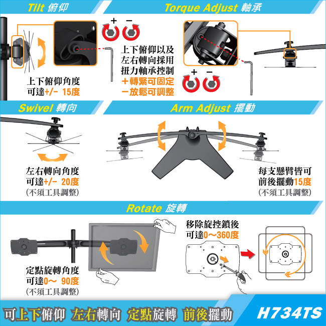 旋臂、支桿及底座皆採用鋁合金開模鑄造、一體成型,擁有外型流線、質地堅硬、主體防鏽、質量輕穎等優點;硬度、載重度與防鏽皆經過檢驗,耐重達12x4公斤,本體絕對不會變形,所以HE的產品能提供給消費者5年的保固期,保證支架在正確的使用下能歷久彌新。