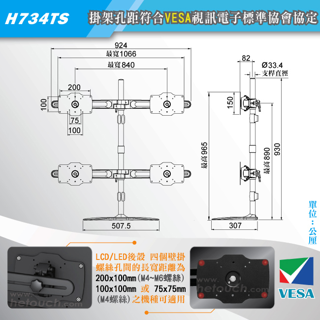 現今各大廠牌的螢幕為跟隨壁掛潮流,皆在螢幕背面預留四個壁掛專用螺絲孔,而孔與孔間的距離,則稱為孔距,由於各家螢幕設計不同,所以孔距的長寬距離都不盡相同,為免此困擾,國際VESA規範訂出多種標準孔距(10x10 / 20x10 / 20x20 / 40x20 / 60x40 / 80x40公分),但各廠商又因為顯示器大小與重量不同而使用不同的標準孔距,甚至有些製造商不跟隨VESA標準,為因應繁多的孔距,HE在此為您推出通用型多功能支架,除了真正通過VESA標準外,也適用於孔距長20公分/寬10公分(可搭配M4/M5/M6螺絲)、長10公分/寬10公分(可搭配M4螺絲)或長7.5公分/寬7.5公分(可搭配M4螺絲)的螢幕,請您在購買本產品前測量顯示器所使用的孔距是否符合以上範圍。