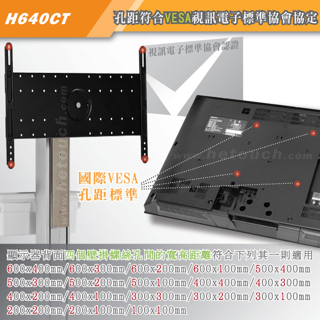 現今各大廠牌的顯示器為跟隨壁掛潮流,皆在顯示器背面預留四個壁掛專用螺絲孔,而孔與孔間的距離,則稱為孔距,由於各家顯示器設計不同,所以孔距的寬高距離都不盡相同,為免此困擾,國際VESA規範訂出多種標準孔距,但各廠商又因為顯示器大小與重量不同而使用不同的標準孔距,為因應繁多的孔距,HE在此為您推出通用型多媒體推車,適用孔距寬60公分x高40公分、寬60公分x高30公分、寬60公分x高20公分、寬60公分x高10公分、寬50公分x高40公分、寬50公分x高30公分、寬50公分x高20公分、寬50公分x高10公分、寬40公分x高40公分、寬40公分x高30公分、寬40公分x高20公分、寬40公分x高10公分、寬30公分x高30公分、寬30公分x高20公分、寬30公分x高10公分、寬20公分x高20公分、寬20公分x高10公分、寬10公分x高10公分的顯示器,請您在購買本產品前自行測量顯示器背面孔距或向顯示器廠商詢問。