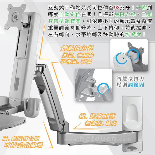 此工作站可全方位多角度升降及移動,藉以調整至舒適的操作位置;並可依據不同的顯示器及週邊設備重量來調整高低升降、上下俯仰、前後拉伸、左右轉向、水平旋轉及移動時的流暢度,完全實現人體工學以人為尊的概念。