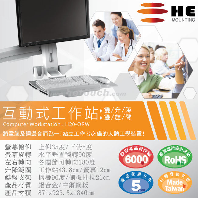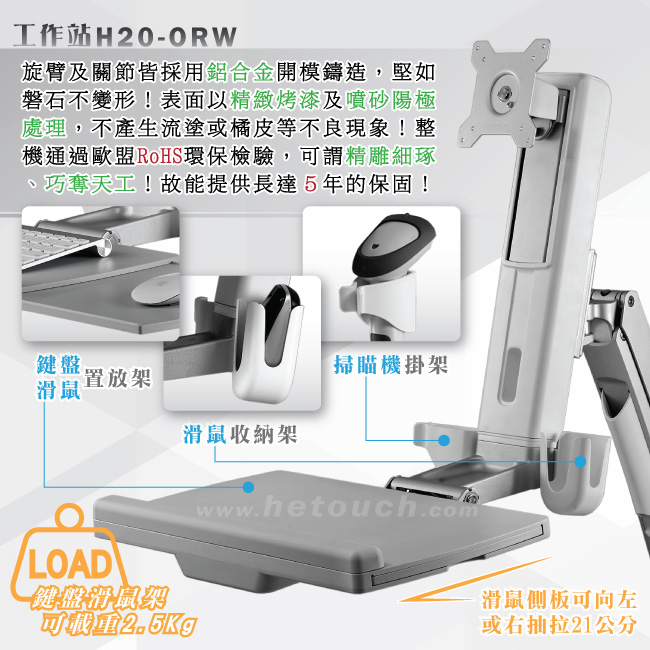 非採用氣壓或油壓棒控制升降,沒有洩氣及漏油等問題,所以裝置新一代扭力桿的旋臂及柱體,可耐重2公斤以上8公斤以下的顯示器與2.5公斤以內的週邊設備,不會日久鬆弛、一蹶不振,故HE能提供長達5年的保固期。