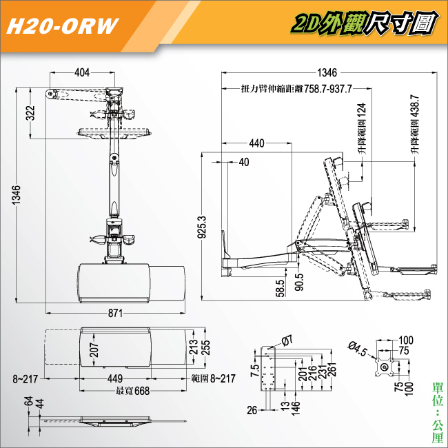 拉伸範圍 (前後拉伸) 工作站 : 32.2~134.6 公分(含展開後鍵盤滑鼠架)