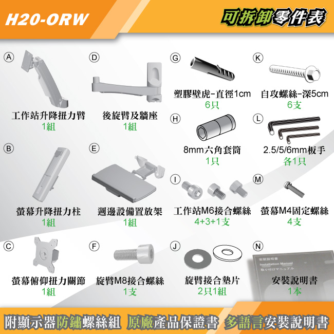 內附的壁掛自攻螺絲、顯示器固定螺絲均經過鍍鎳或防鏽處理,不銹蝕變形。長5公分的自攻螺絲及直徑10公厘的塑膠壁虎,可用於水泥、磚牆等一般牆面,另外自攻螺絲也可單獨使用於木板牆面(實心厚度須大於3公分),HE的螺絲針對以上牆面皆可讓牆座緊貼,並讓工作站穩固、耐用、抗震!!保護您使用上的安全