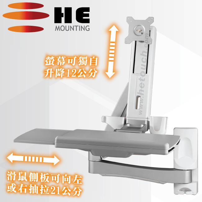 牆座採用中鋼鋼材一體成型開模製造,鋼板厚3公厘、高27.5公分、寬8.8公分,鎖附內附的鍍鎳自攻螺絲後,更能提升牆面咬合力達4倍以上的前端重量,HE堅持絕不將牆座中央或兩側挖空,降低與牆面的咬合力,因為在外銷上,須通過規範的牆座面積與厚度,方能進軍歐美市場,而在本土銷售中,HE則要帶給消費者最安全的設備,由於牆座越厚實,與牆面的咬合力才能足夠,雖然多數業者並不在意,第一因為台灣未立法,第二則是減少牆座的面積,來降低成本,但請您審慎考慮,台灣的地震何其多,在這工作站前所承載的可是貴重的顯示器及週邊設備,不堪一摔! 所以HE堅持以安全性為優先考量!