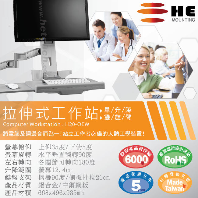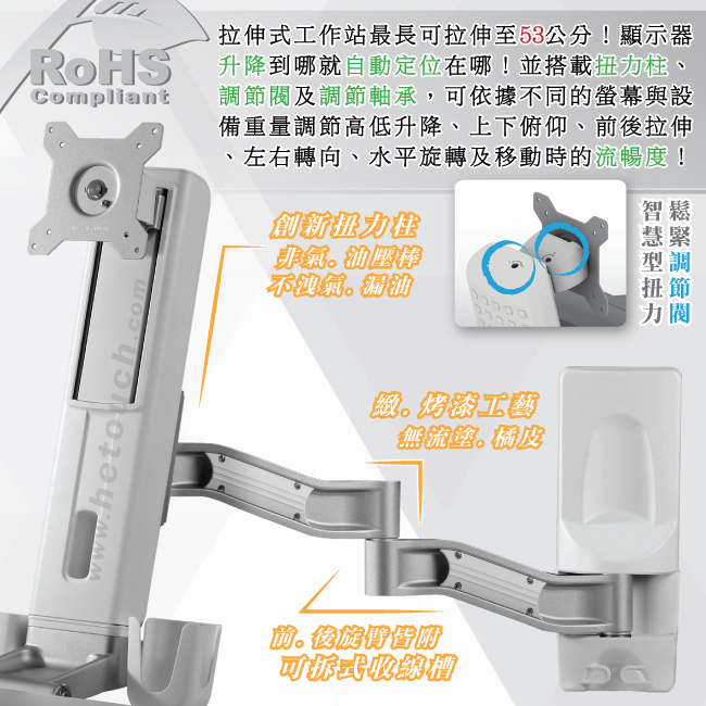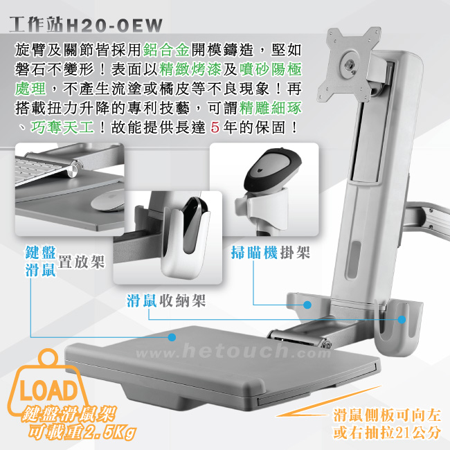 非採用氣壓或油壓棒控制升降,沒有洩氣及漏油等問題,所以裝置新一代扭力桿的柱體,可耐重2公斤以上8公斤以下的顯示器,不會日久鬆弛、一蹶不振,故HE能提供長達5年的保固期。