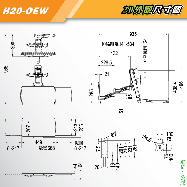 拉伸範圍 (前後拉伸) 工作站 : 30~93.5 公分(含展開後鍵盤滑鼠架)