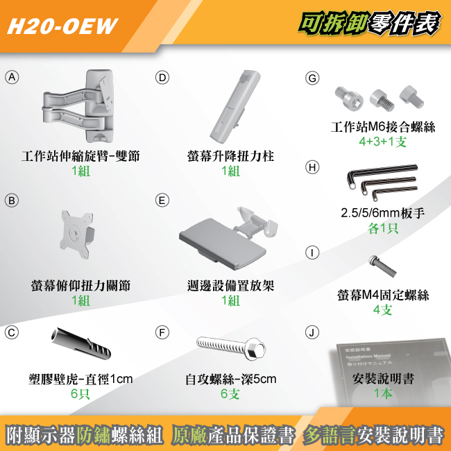 內附的壁掛自攻螺絲、顯示器固定螺絲均經過鍍鎳或防鏽處理,不銹蝕變形。長5公分的自攻螺絲及直徑10公厘的塑膠壁虎,可用於水泥、磚牆等一般牆面,另外自攻螺絲也可單獨使用於木板牆面(實心厚度須大於3公分),HE的螺絲針對以上牆面皆可讓牆座緊貼,並讓工作站穩固、耐用、抗震!!保護您使用上的安全