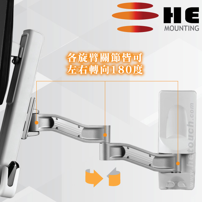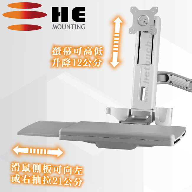 牆座採用中鋼鋼材一體成型開模製造,鋼板厚3公厘、高27.5公分、寬8.8公分,鎖附內附的鍍鎳自攻螺絲後,更能提升牆面咬合力達4倍以上的前端重量,HE堅持絕不將牆座中央或兩側挖空,降低與牆面的咬合力,因為在外銷上,須通過規範的牆座面積與厚度,方能進軍歐美市場,而在本土銷售中,HE則要帶給消費者最安全的設備,由於牆座越厚實,與牆面的咬合力才能足夠,雖然多數業者並不在意,第一因為台灣未立法,第二則是減少牆座的面積,來降低成本,但請您審慎考慮,台灣的地震何其多,在這工作站前所承載的可是貴重的顯示器及週邊設備,不堪一摔! 所以HE堅持以安全性為優先考量!