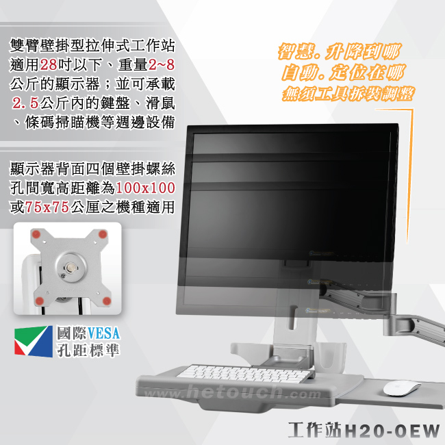 專現今各大廠牌的螢幕為跟隨掛架潮流,皆在螢幕背面預留四個掛架專用螺絲孔,而孔與孔間的距離,則稱為孔距,由於各家螢幕設計不同,所以孔距的長寬距離都不盡相同,為免此困擾,國際VESA規範訂出多種標準孔距(10x10 / 20x10 / 20x20 / 40x20 / 60x40 / 80x40公分),但各廠商又因為螢幕大小與重量不同而使用不同的標準孔距,甚至有些製造商不跟隨VESA標準,為因應繁多的孔距,HE在此為您推出通用型工作站,除了真正通過VESA標準外,也適用於孔距長10公分/寬10公分或長7.5公分/寬7.5公分的螢幕,請您在購買本產品前測量螢幕所使用的孔距是否符合以上範圍。