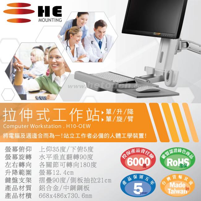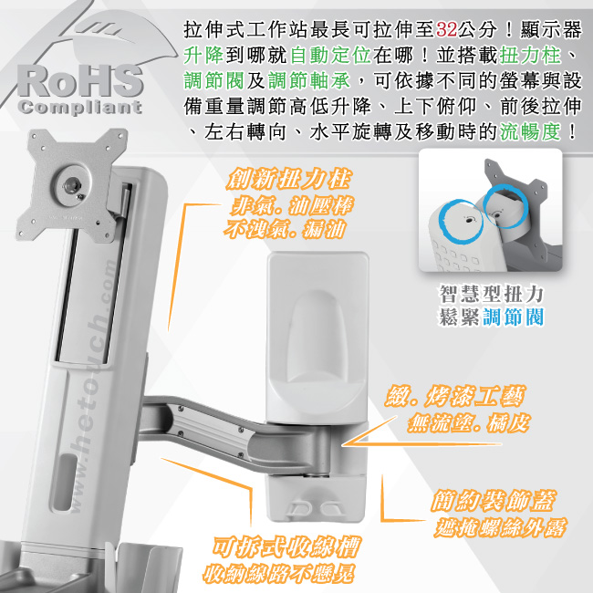 非採用氣壓或油壓棒控制升降,沒有洩氣及漏油等問題,所以裝置新一代扭力桿的柱體,可耐重2公斤以上8公斤以下的顯示器,不會日久鬆弛、一蹶不振,故HE能提供長達5年的保固期。