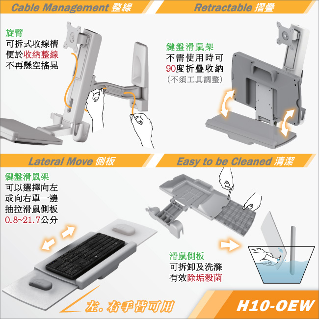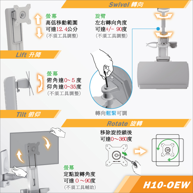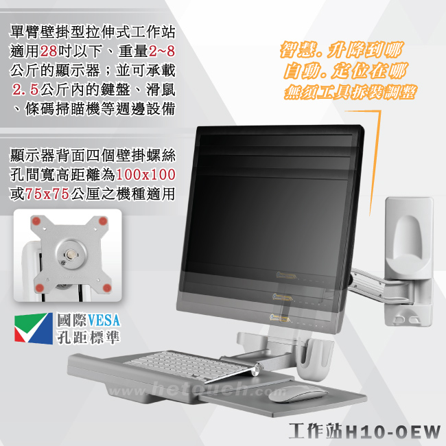 單升降.單旋臂.螢幕鍵盤架(壁掛型) - H10OEW