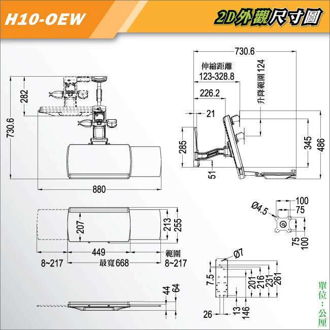 拉伸範圍 (前後拉伸) 工作站 : 28.2~73.06 公分(含展開後鍵盤滑鼠架)