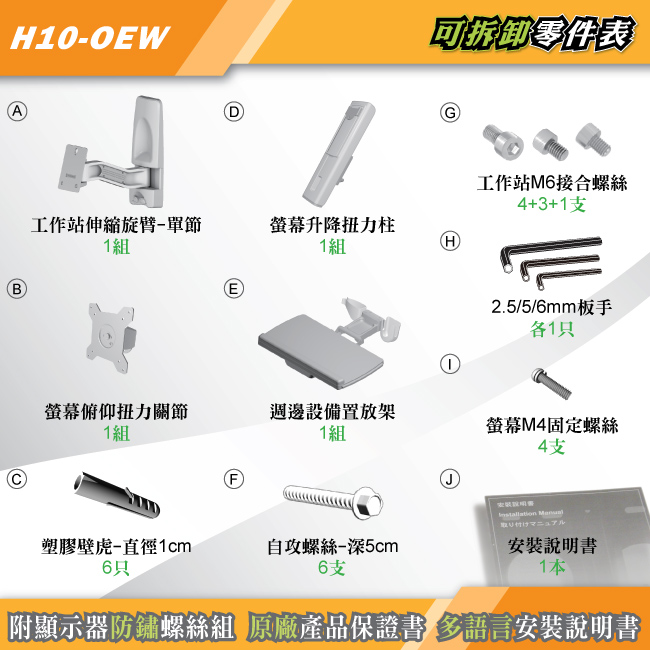 內附的壁掛自攻螺絲、顯示器固定螺絲均經過鍍鎳或防鏽處理,不銹蝕變形。長5公分的自攻螺絲及直徑10公厘的塑膠壁虎,可用於水泥、磚牆等一般牆面,另外自攻螺絲也可單獨使用於木板牆面(實心厚度須大於3公分),HE的螺絲針對以上牆面皆可讓牆座緊貼,並讓工作站穩固、耐用、抗震!!保護您使用上的安全
