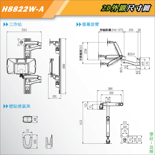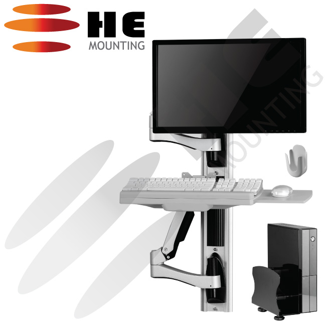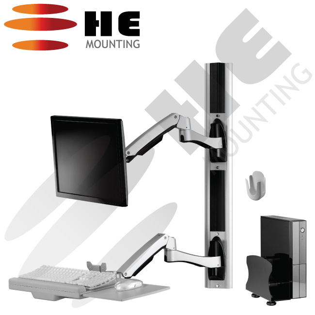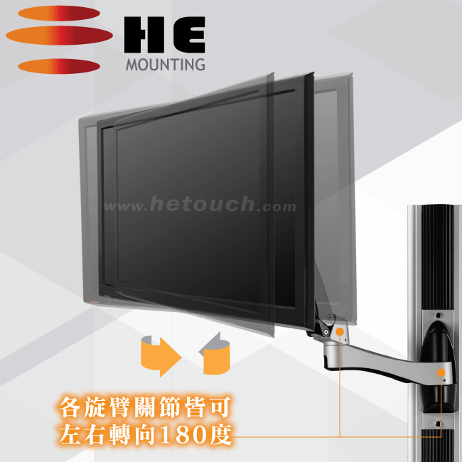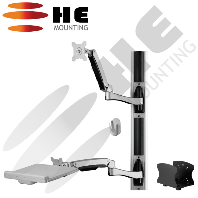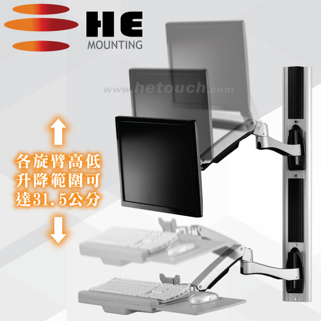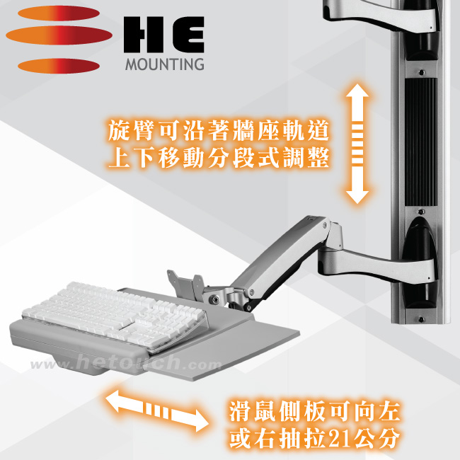 牆座採用鋁合金一體成型開模製造,最厚處達5公厘、高88公分、寬11公分,緊鎖內附的鍍鎳自攻螺絲後,更能提升牆面咬合力達4倍以上的前端重量,HE堅持絕不將牆座中央或兩側挖空,降低與牆面的咬合力,因為在外銷上,須通過規範的牆座面積與厚度,方能進軍歐美市場,而在本土銷售中,HE則要帶給消費者最安全的設備,由於牆座越厚實,與牆面的咬合力才能足夠,雖然多數業者並不在意,第一因為台灣未立法,第二則是減少牆座的面積,來降低成本,但請您審慎考慮,台灣的地震何其多,在這工作站前所承載的可是貴重的顯示器及週邊設備,不堪一摔! 所以HE堅持以安全性為優先考量!