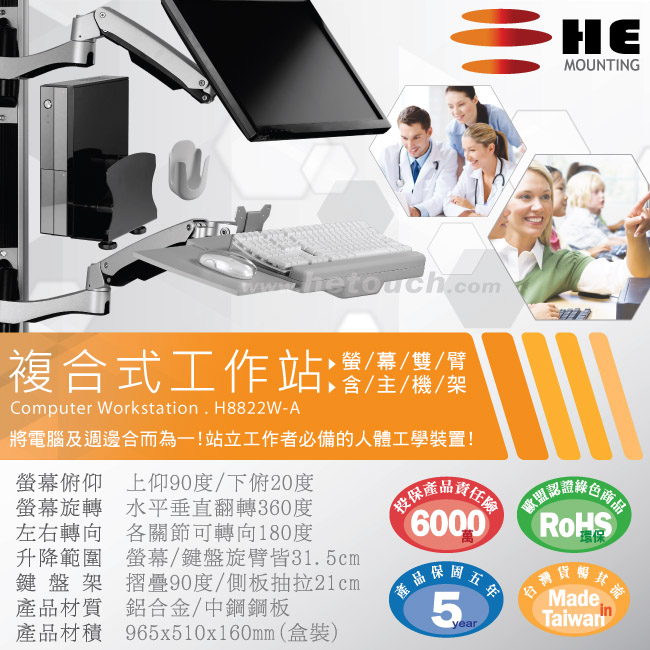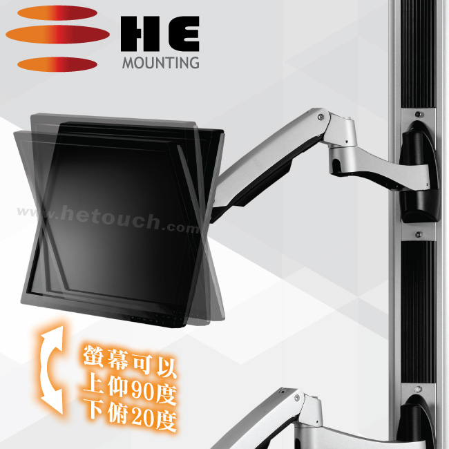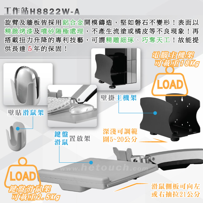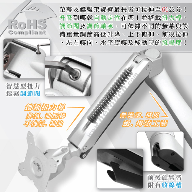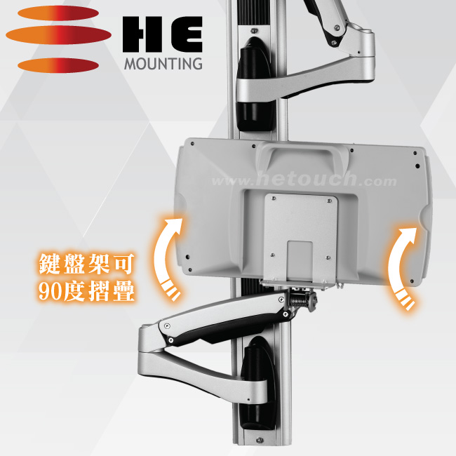 非採用氣壓或油壓棒控制升降,沒有洩氣及漏油等問題,所以裝置新一代扭力桿的旋臂,可耐重2公斤以上10公斤以下的顯示器與2.5公斤以內的鍵盤滑鼠等週邊設備,不會日久鬆弛、一蹶不振,故HE能提供長達5年的保固期。