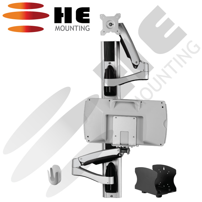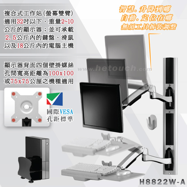 專現今各大廠牌的螢幕為跟隨掛架潮流,皆在螢幕背面預留四個掛架專用螺絲孔,而孔與孔間的距離,則稱為孔距,由於各家螢幕設計不同,所以孔距的長寬距離都不盡相同,為免此困擾,國際VESA規範訂出多種標準孔距(10x10 / 20x10 / 20x20 / 40x20 / 60x40 / 80x40公分),但各廠商又因為螢幕大小與重量不同而使用不同的標準孔距,甚至有些製造商不跟隨VESA標準,為因應繁多的孔距,HE在此為您推出通用型工作站,除了真正通過VESA標準外,也適用於孔距長10公分/寬10公分或長7.5公分/寬7.5公分的螢幕,請您在購買本產品前測量螢幕所使用的孔距是否符合以上範圍。