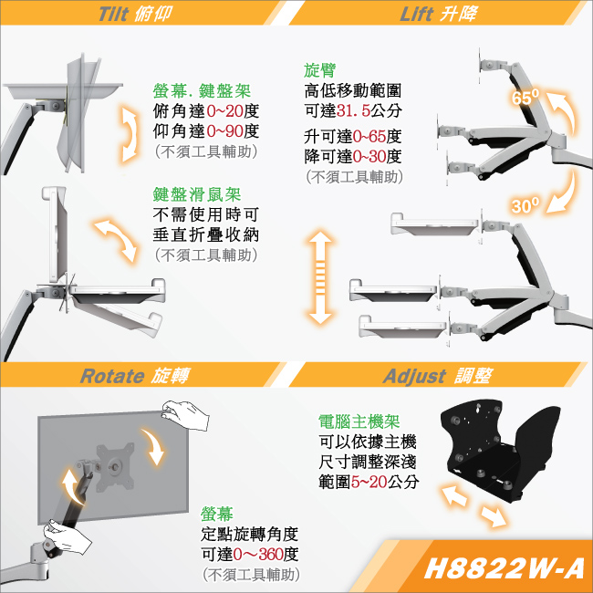 專利俯仰及升降扭力調節閥,可依據顯示器或週邊設備重量調節扭力大小,載重轉緊、載輕放鬆(僅須調節一次 / 隨附調節器),用以控制升降及俯仰的流暢度,優點為顯示器或鍵盤滑鼠架在高低升降或上下俯仰時,不須任何工具或螺絲,隨調整即定位,讓視角及操作平台穩如泰山、不會疲乏下垂。另外,首創轉向鬆緊調節軸承(隨附調節器),可調整左右轉向及前後拉伸時的流暢度。