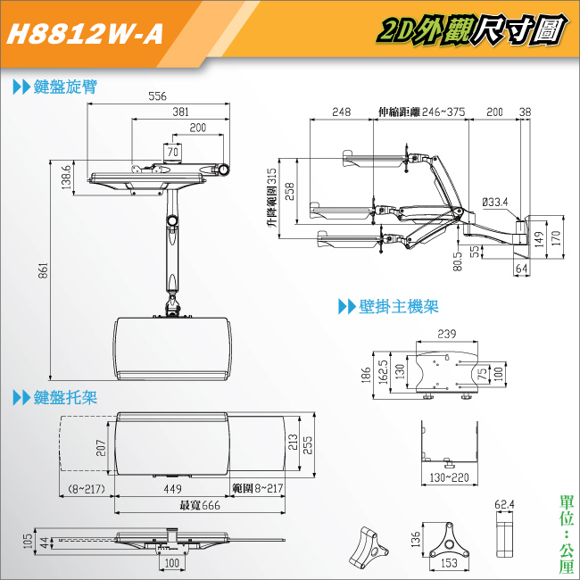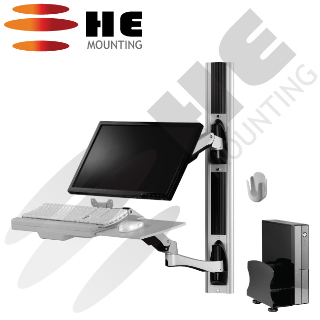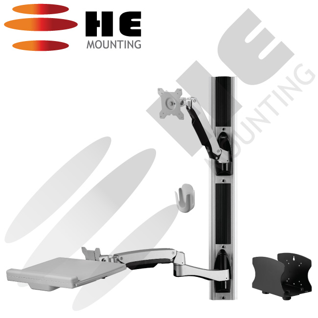 牆座採用鋁合金一體成型開模製造,最厚處達5公厘、高88公分、寬11公分,緊鎖內附的鍍鎳自攻螺絲後,更能提升牆面咬合力達4倍以上的前端重量,HE堅持絕不將牆座中央或兩側挖空,降低與牆面的咬合力,因為在外銷上,須通過規範的牆座面積與厚度,方能進軍歐美市場,而在本土銷售中,HE則要帶給消費者最安全的設備,由於牆座越厚實,與牆面的咬合力才能足夠,雖然多數業者並不在意,第一因為台灣未立法,第二則是減少牆座的面積,來降低成本,但請您審慎考慮,台灣的地震何其多,在這工作站前所承載的可是貴重的顯示器及週邊設備,不堪一摔! 所以HE堅持以安全性為優先考量!