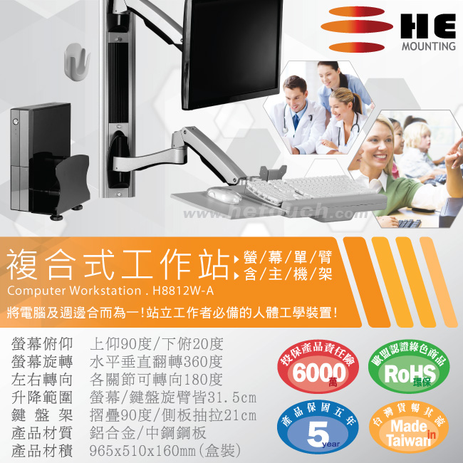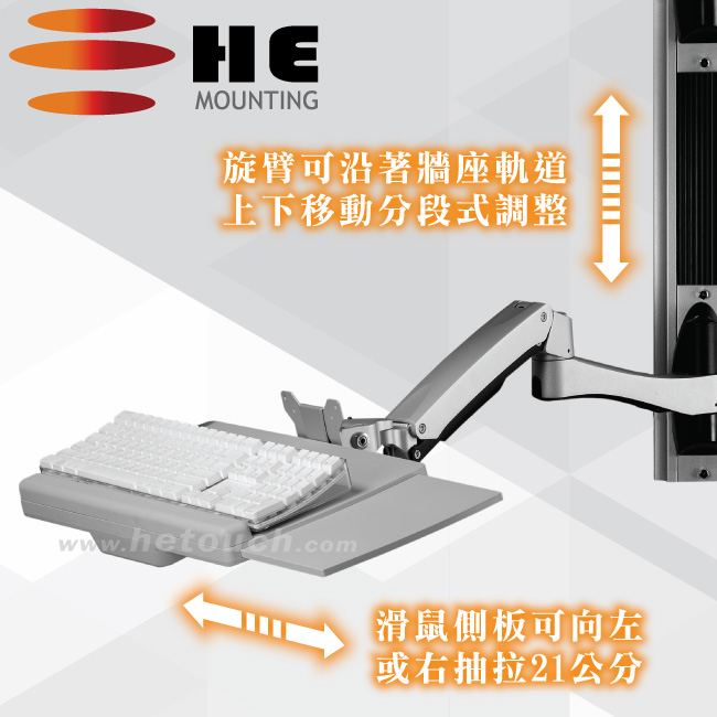 非採用氣壓或油壓棒控制升降,沒有洩氣及漏油等問題,所以裝置新一代扭力桿的旋臂,可耐重2公斤以上10公斤以下的顯示器與2.5公斤以內的鍵盤滑鼠等週邊設備,不會日久鬆弛、一蹶不振,故HE能提供長達5年的保固期。