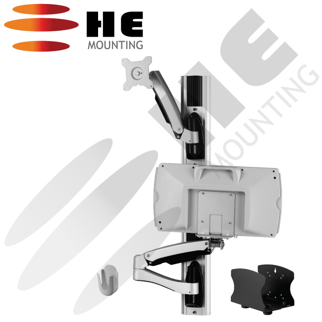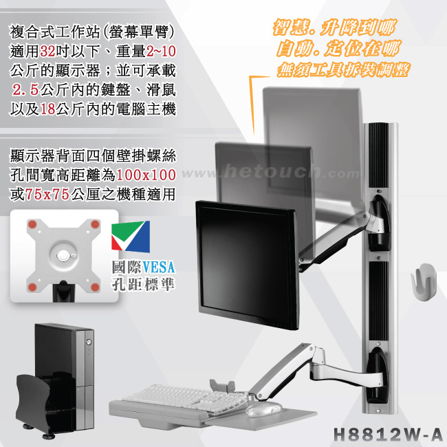專現今各大廠牌的螢幕為跟隨掛架潮流,皆在螢幕背面預留四個掛架專用螺絲孔,而孔與孔間的距離,則稱為孔距,由於各家螢幕設計不同,所以孔距的長寬距離都不盡相同,為免此困擾,國際VESA規範訂出多種標準孔距(10x10 / 20x10 / 20x20 / 40x20 / 60x40 / 80x40公分),但各廠商又因為螢幕大小與重量不同而使用不同的標準孔距,甚至有些製造商不跟隨VESA標準,為因應繁多的孔距,HE在此為您推出通用型工作站,除了真正通過VESA標準外,也適用於孔距長10公分/寬10公分或長7.5公分/寬7.5公分的螢幕,請您在購買本產品前測量螢幕所使用的孔距是否符合以上範圍。