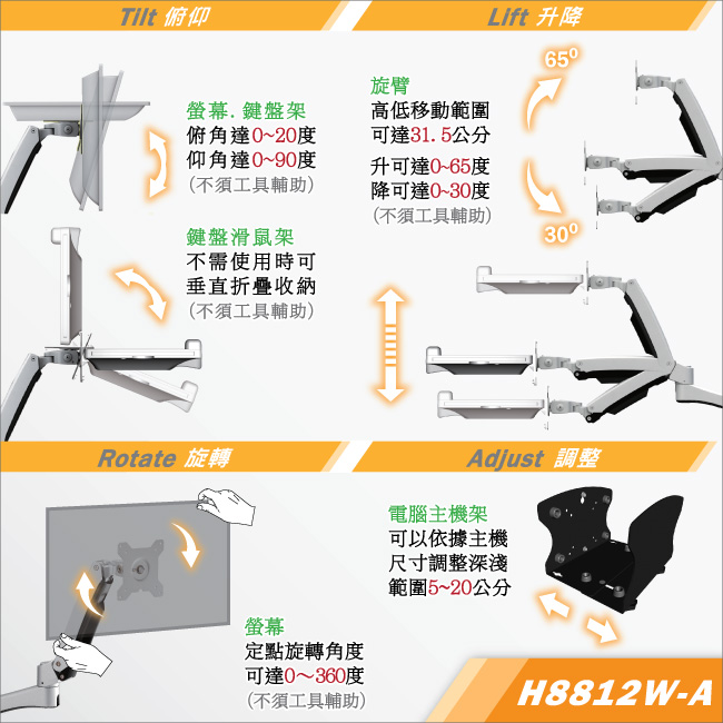 專利俯仰及升降扭力調節閥,可依據顯示器或週邊設備重量調節扭力大小,載重轉緊、載輕放鬆(僅須調節一次 / 隨附調節器),用以控制升降及俯仰的流暢度,優點為顯示器或鍵盤滑鼠架在高低升降或上下俯仰時,不須任何工具或螺絲,隨調整即定位,讓視角及操作平台穩如泰山、不會疲乏下垂。另外,首創轉向鬆緊調節軸承(隨附調節器),可調整左右轉向及前後拉伸時的流暢度。