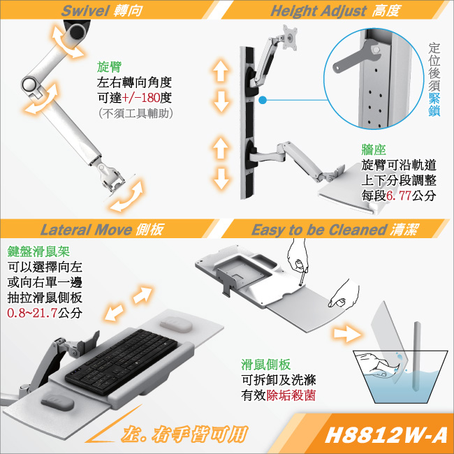 此工作站可全方位多角度移動,顯示器及鍵盤滑鼠架更可獨立高低升降,藉以調整至舒適的操作位置;旋臂並附有調節閥及調節軸承,可依據不同的顯示器或週邊設備重量來調整高低升降、上下俯仰、前後拉伸、左右轉向及移動時的流暢度,完全實現人體工學以人為尊的概念。