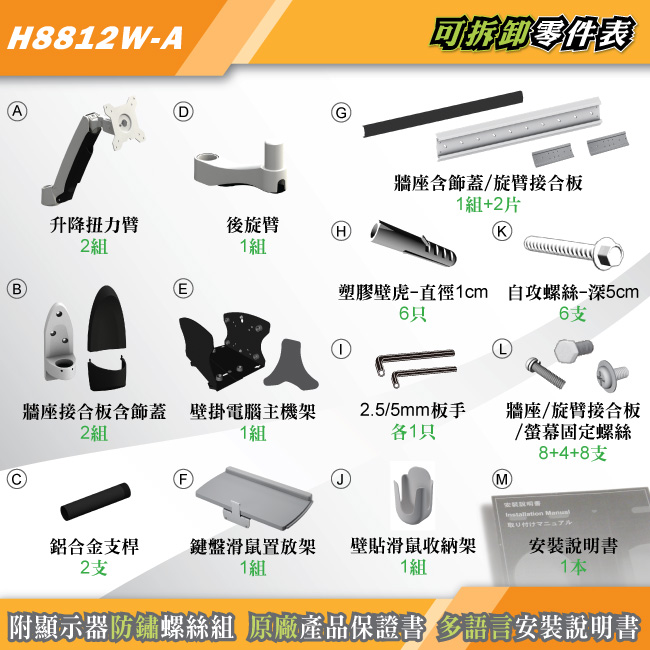 內附的壁掛自攻螺絲及固定用螺絲均經過鍍鎳或防鏽處理,不銹蝕變形。長5公分的自攻螺絲及直徑10公厘的塑膠壁虎,可用於水泥、磚牆等一般牆面,另外自攻螺絲也可單獨使用於木板牆面(實心厚度須大於3公分),HE的螺絲針對以上牆面皆可讓牆座緊貼,並讓工作站穩固、耐用、抗震!!保護您使用上的安全!!