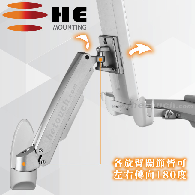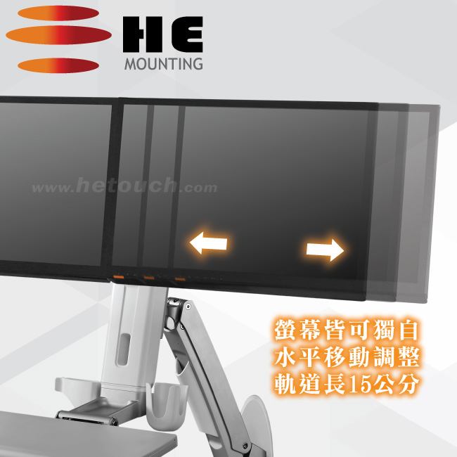非採用氣壓或油壓棒控制升降,沒有洩氣及漏油等問題,所以裝置新一代扭力桿的旋臂及柱體,可承載1公斤以上4公斤以下同重量的顯示器兩部,或總重2公斤以上8公斤以下的雙顯示器,與2.5公斤以內的週邊設備,不會日久鬆弛、一蹶不振,故HE能提供長達5年的保固期。