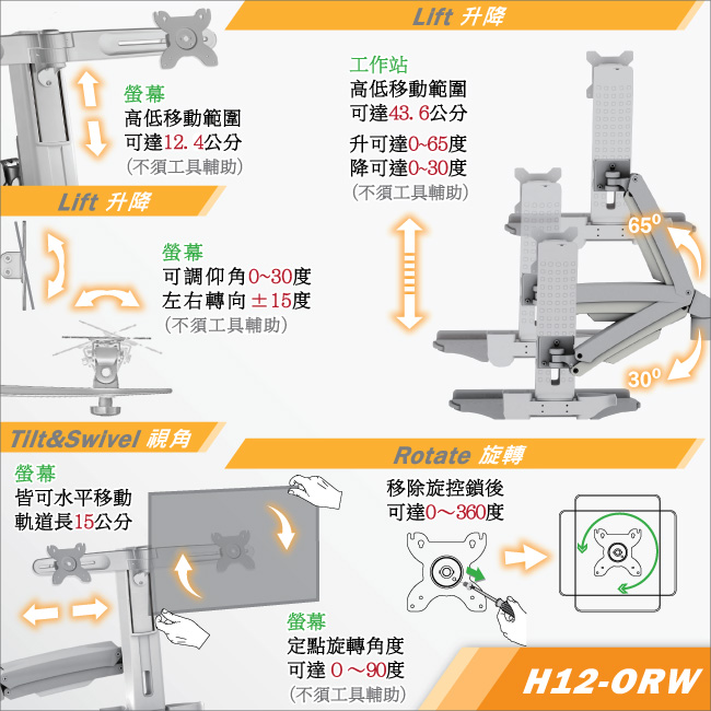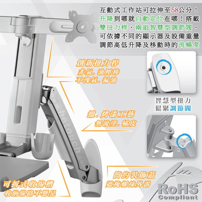 升降採用專利創新雙扭力桿(旋臂+柱體)搭載智慧型調節閥,可依據顯示器及週邊設備重量來調節扭力大小,載重轉緊、載輕放鬆(僅須調節一次 / 隨附調節器),用以控制升降的流暢度,優點為螢幕鍵盤架或顯示器在高低升降時,不須任何工具或螺絲,升降到哪就自動定位在哪,讓平台及視角穩如泰山、不會疲乏下垂。