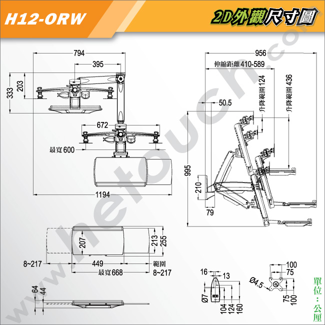 牆座採用鋁合金一體成型開模製造,最厚處達16公厘、高20.4公分、寬6.5公分,鎖附內附的鍍鎳自攻螺絲後,更能提升牆面咬合力達4倍以上的前端重量,HE堅持絕不將牆座中央或兩側挖空,降低與牆面的咬合力,因為在外銷上,須通過規範的牆座面積與厚度,方能進軍歐美市場,而在本土銷售中,HE則要帶給消費者最安全的設備,由於牆座越厚實,與牆面的咬合力才能足夠,雖然多數業者並不在意,第一因為台灣未立法,第二則是減少牆座的面積,來降低成本,但請您審慎考慮,台灣的地震何其多,在這螢幕鍵盤架前所承載的可是貴重的顯示器及週邊設備,不堪一摔! 所以HE堅持以安全性為優先考量!