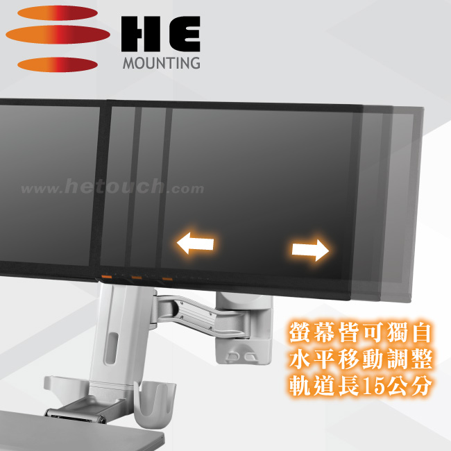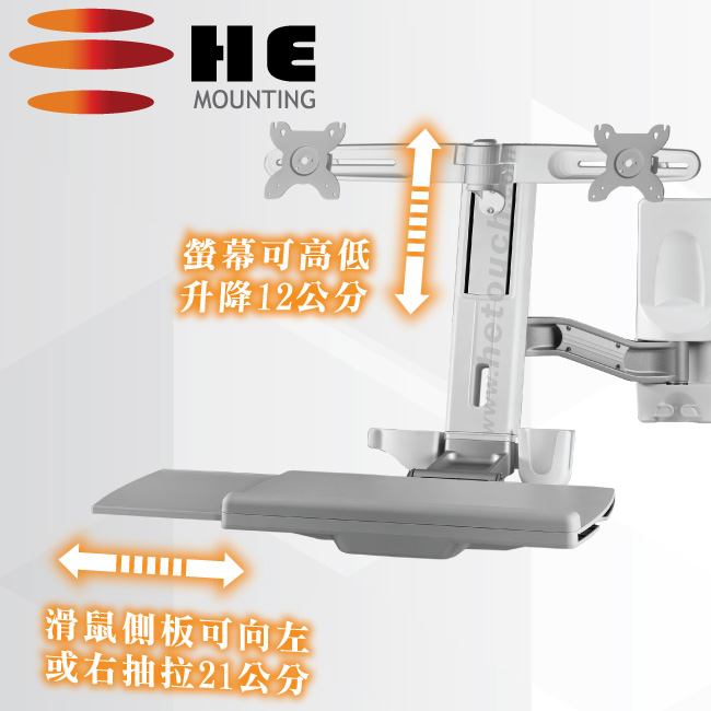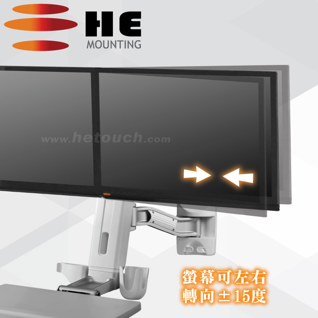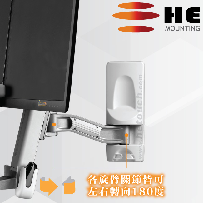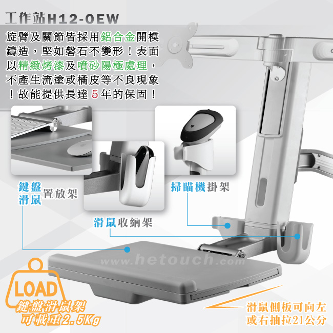 非採用氣壓或油壓棒控制升降,沒有洩氣及漏油等問題,所以裝置新一代扭力桿的柱體,可承載1公斤以上4公斤以下同重量的顯示器兩部,或總重2公斤以上8公斤以下的雙顯示器,不會日久鬆弛、一蹶不振,故HE能提供長達5年的保固期。