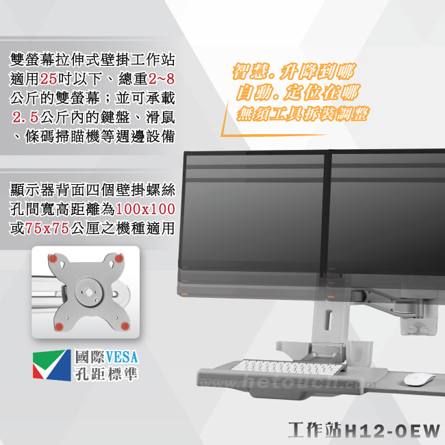 承載重量 螢幕 : 兩台總重須超過2公斤並低於8公斤 / 鍵盤+滑鼠 : 須低於2.5公斤