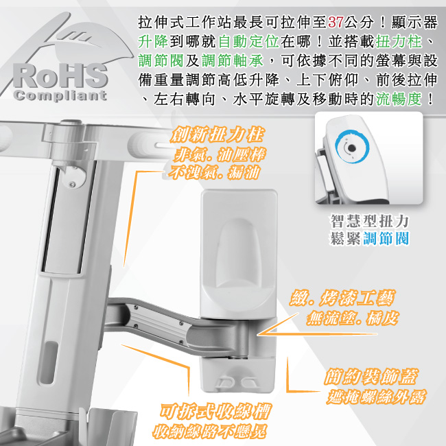 旋臂及關節皆採用鋁合金開模鑄造、一體成型,擁有外型流線、質地堅硬、主體防鏽、質量輕穎等優點;硬度、載重度與防鏽皆經過測試,本體絕對不會變形,保證螢幕鍵盤架在正確的使用下能歷久彌新。