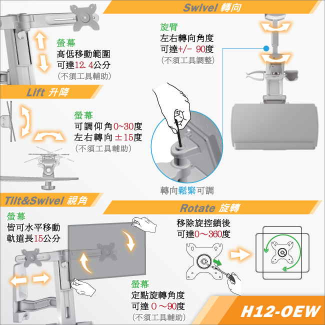 高低範圍 (垂直移動) 螢幕 : 高低差達12.4公分 自由調整