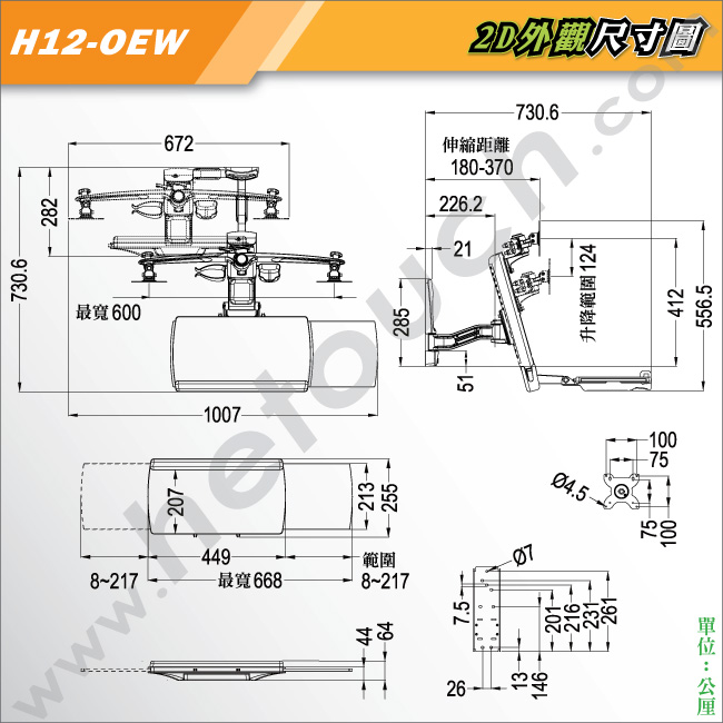 拉伸範圍 (前後拉伸) 工作站 : 28.2~73.06 公分(含展開後鍵盤滑鼠架)