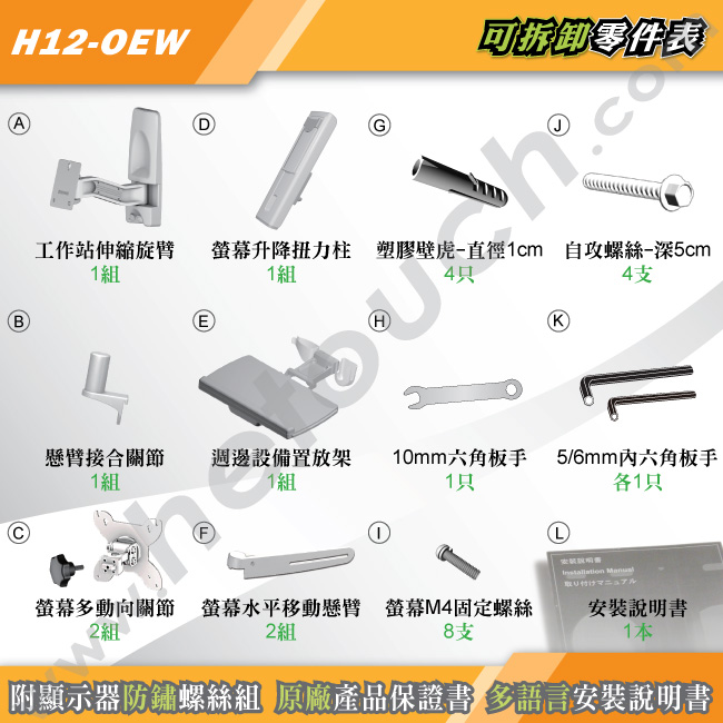 內附的壁掛自攻螺絲、顯示器固定螺絲均經過鍍鎳或防鏽處理,不銹蝕變形。長5公分的自攻螺絲及直徑10公厘的塑膠壁虎,可用於水泥、磚牆等一般牆面,另外自攻螺絲也可單獨使用於木板牆面(實心厚度須大於3公分),HE的螺絲針對以上牆面皆可讓牆座緊貼,並讓螢幕鍵盤架穩固、耐用、抗震!!保護您使用上的安全