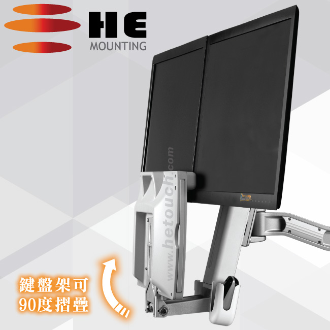 此螢幕鍵盤架可全方位多角度移動,顯示器更可單獨高低升降,藉以調整至舒適的操作位置;旋臂並附有調節軸承,可依據不同的顯示器及週邊設備重量來調整前後拉伸、左右轉向及移動時的流暢度,完全實現人體工學以人為尊的概念。