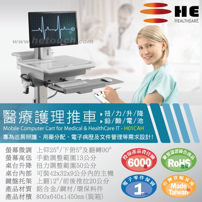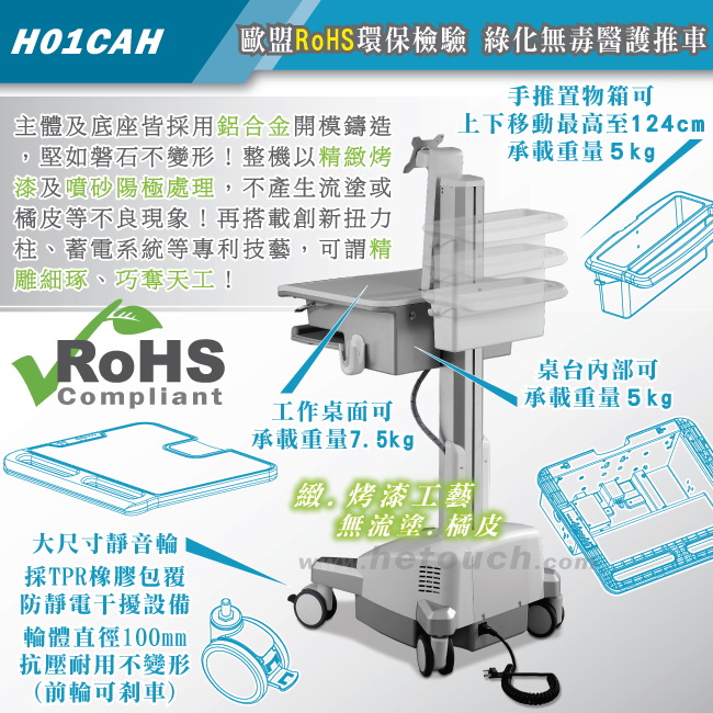全機塗料與零件經檢驗皆通過歐盟RoHS危害性物質限制令的規範,稱之為長青、綠化料件,在此HE除了推薦您購買我們的醫療護理車,也推薦您購買真正的綠化產品。