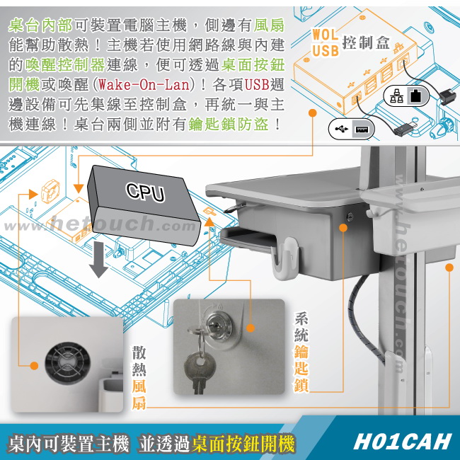 電腦主機若使用網路線與內建的喚醒控制器連線,並在主機的BIOS完成設定,便可透過桌面按鈕開機或喚醒系統(Wake-On-Lan),而不必將桌面拆下才能啟動桌台內部的主機。