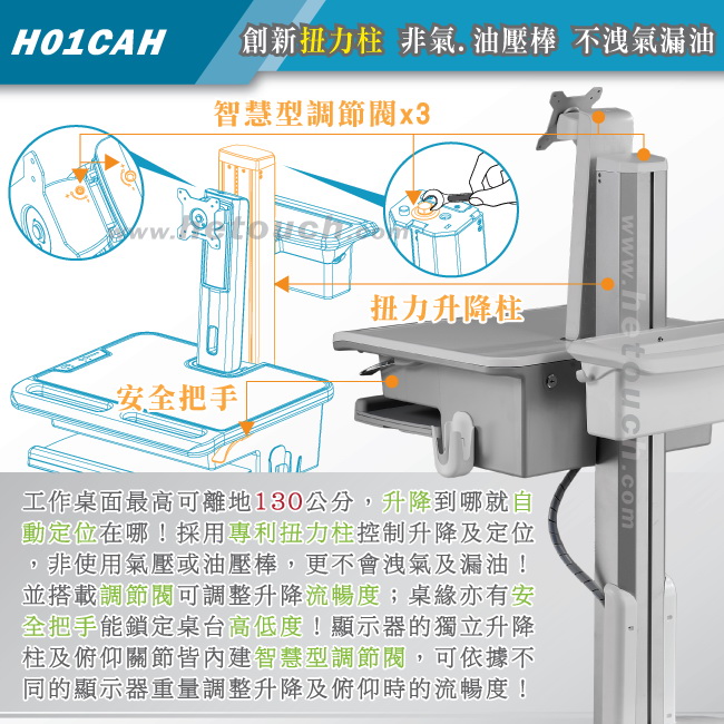 專利扭力柱搭載智慧型調節閥,可依據桌台的總載重量來調節扭力大小,載重轉緊、載輕放鬆(僅須調節一次),用以控制升降的流暢度,優點為桌台在高低升降時,不須任何工具或螺絲,僅需向上扳壓桌緣的安全把手即可調整高低度,範圍達50公分,升降到哪就自動定位在哪,隨調整即定位;鬆開安全把手後即能鎖定桌台高低,讓桌台穩如泰山、不會疲乏下垂。
