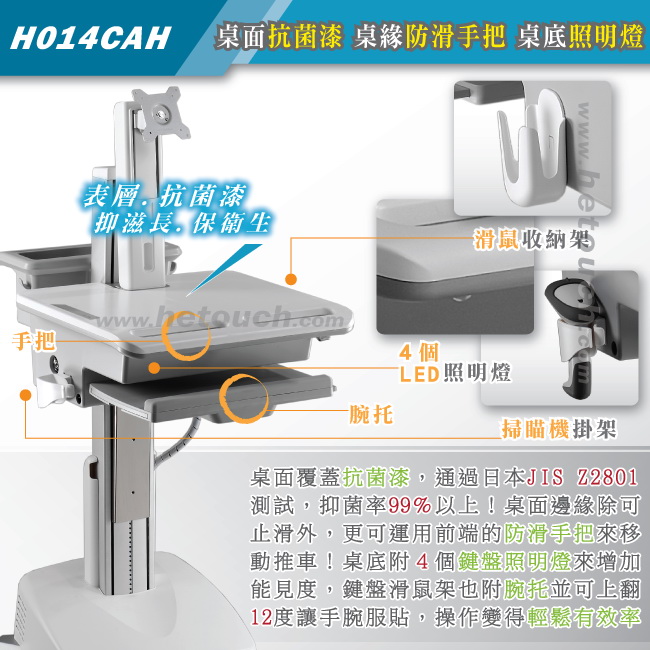 桌面覆蓋具有抑菌滋長的抗菌漆,經SGS以日本工業標準JIS Z2801方式檢驗,針對金黃色葡萄球菌、大腸桿菌測試,抑菌率達99%以上,可確保醫療護理環境的衛生。