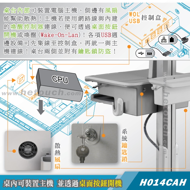 電腦主機若使用網路線與內建的喚醒控制器連線,並在主機的BIOS完成設定,便可透過桌面按鈕開機或喚醒系統(Wake-On-Lan),而不必將桌面拆下才能啟動桌台內部的主機。