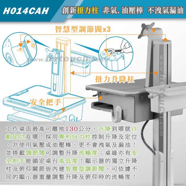 專利扭力柱搭載智慧型調節閥,可依據桌台的總載重量來調節扭力大小,載重轉緊、載輕放鬆(僅須調節一次),用以控制升降的流暢度,優點為桌台在高低升降時,不須任何工具或螺絲,僅需向上扳壓桌緣的安全把手即可調整高低度,範圍達50公分,升降到哪就自動定位在哪,隨調整即定位;鬆開安全把手後即能鎖定桌台高低,讓桌台穩如泰山、不會疲乏下垂。