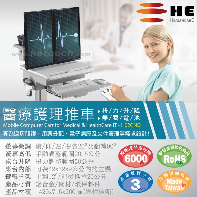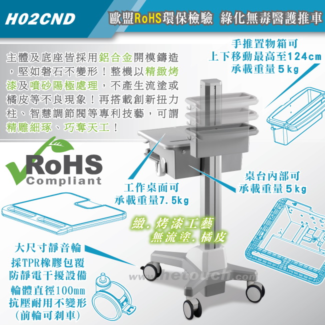 全機塗料與零件經檢驗皆通過歐盟RoHS危害性物質限制令的規範,稱之為長青、綠化料件,在此HE除了推薦您購買我們的醫療護理車,也推薦您購買真正的綠化產品。